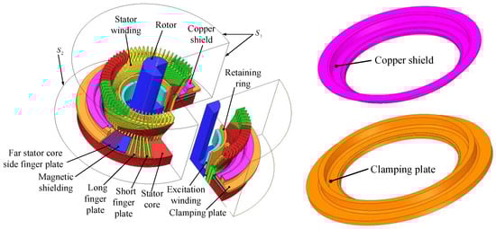 The 300 Mvar synchronous condenser researched in this paper is the first high-capacity condenser to be produced. According to the actual structural characteristics of the end of the condenser, it consists of a copper shield, clamping plate, far stator core side finger plate, magnetic shield, long finger plate, short finger plate, stator core, retaining ring and rotor. The specific structure of the model is shown in Figure 1. The rated parameters and some basic structural parameters of the synchronous condenser are given in Table 1.