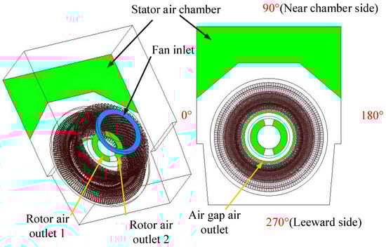 The stator of the large synchronous condenser researched in this paper is cooled by air. An axial fan is used in the end of the condenser. Under the action of the fan, the cooling air enters the end domain of condenser from the fan, and a part of the cooling medium enters the stator side of the end to cool the structural parts in the end of the stator; a part of the cooling medium directly enters the rotor position in the end of the condenser, which directly cools the rotor. The cooling medium entering the rotor side in the end and the cooling medium entering the stator side in the end do not converge further, but flow into the straight section from the stator air chamber and the air outlet in the end of the rotor, respectively. Furthermore, the influence of rotor heating on the temperature increase in the end structure of the stator is ignored. The fluid–solid coupling heat transfer model is shown in Figure 2.