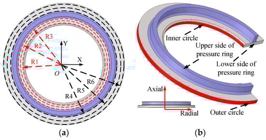 Clamping plate sampling position: (a) location of inner and outer surface of clamping plate; (b) inner circle and outer circle of clamping plate.