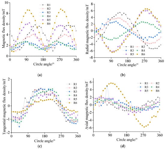 In order to better analyze the magnetic flux density distribution of the clamping plate, the circumference of the radius R1–R6 on the upper surface of the lower side of the clamping plate and the position of the inner circle and outer circle on the lower side of the clamping plate are shown in Figure 3. By solving the three-dimensional electromagnetic field in the end of condenser under original structure, the circumferential magnetic flux density distribution with a radius of R1–R6 on the upper surface of the lower side of the clamping plate under the original structure is obtained, as shown in Figure 4. The distributions of the magnetic flux density, radial magnetic flux density, tangential magnetic flux density and axial magnetic flux density of the circumference with radius of R1–R6 are, respectively, given in Figure 4a–d. It can be seen from Figure 4a that the magnetic flux density of the circumference of the clamping plate presents a sinusoidal regular change. The magnetic flux density decreases from R1 to R3 along the radial direction, and increases from R4 to R6 along the radial direction. At the circumference angle of 90° and 270°, the magnetic density reaches the peak value nearby. In Figure 4b, the radial magnetic flux density also presents a sinusoidal regular change. The radial magnetic flux density from R1 to R3 gradually decreases, and the radial magnetic flux density from R4 to R6 gradually increases. It can be seen from Figure 4c that the tangential magnetic flux density reaches a peak near 180° along the circumference. Figure 4d shows that the axial magnetic flux density of the circumference with radius R1–R5 shows a sinusoidal variation with smaller amplitude of magnetic flux density, while the axial magnetic flux density of the circumference with radius R6 shows a larger amplitude. Because there is copper shield above the circumference of radius R1–R5 and no copper shield above the circumference of radius R6, the axial magnetic flux density of the circumference of radius R6 is larger.