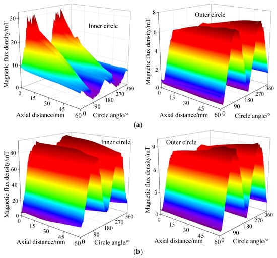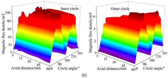 In order to further analyze the influence of the three different schemes on the magnetic flux density distribution of the clamping plate, the magnetic flux density distribution of the inner circle and the outer circle of the clamping plate under the three different schemes are shown in Figure 5. It can be seen from Figure 5 that the magnetic flux density of the inner circle and outer circle of clamping plate under the three schemes are sinusoidal in the circumferential direction, and the magnetic flux density of the inner circle side is higher than that of the outer circle side. In Figure 5a, the magnetic flux density of the inner circle side of the original structure gradually decreases along the positive axial direction, and the decreasing trend is larger. The maximum magnetic flux density of the inner circle of the clamping plate is 30.75 mT, which is due to the copper shield in the original structure that can effectively prevent the leakage flux from entering the clamping plate. The maximum magnetic flux density of the outer circle is 7.25 mT. It can be seen from Figure 5b,c that in Scheme 1 and Scheme 2, the maximum magnetic flux density of the inner circle of the clamping plate is 83.04 mT and 112.93 mT, respectively, the maximum magnetic flux density of the outer circle of the clamping plate is 9.73 mT and 7.11 mT, respectively, and the magnetic flux density of the outer circle side gradually increases along the positive axial direction. In conclusion, the change of the magnetic flux density of the outer circle of the clamping plate along the axial direction is small under the three schemes. However, under the three schemes, the magnetic density of the outer circle of the clamping plate is the largest in Scheme 2, the second largest in Scheme 1, and the smallest in the original structure.