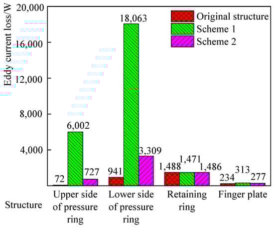 According to Formula (6), the eddy current loss of each structural part in the end of the condenser, under three different schemes, is shown in Figure 6. From the calculation results, compared with the original structure, in Scheme 1, the eddy current loss of the upper side of the clamping plate is increased by 5930 W, the eddy current loss of the lower side of the clamping plate is increased by 17,122 W, the eddy current loss of the retaining ring is reduced by 1.14%, and the eddy current loss of the finger plate is increased by 33.76%. Compared with the original structure, under Scheme 2, the eddy current loss increases by 665 W at the upper side of the clamping plate, 2368 W at the lower side of the clamping plate, 0.13% at the retaining ring and 18.37% at the finger plate.
