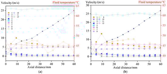 In order to research the fluid change law near the clamping plate under the three schemes, Figure 8a shows the velocity distribution and fluid temperature distribution of the clamping plate’s leeward side (270°). Figure 8b shows the velocity distribution and fluid temperature distribution of the clamping plate near the chamber side (90°). As can be seen from Figure 8a, on the leeward side, under the original structure, the velocity in the inner circle of the clamping plate increases first and then decreases along the positive axial direction. Under Scheme 1 and Scheme 2, the velocity of cooling medium increases gradually along the positive direction of the inner circle axial direction, and they have the same flow velocity. The fluid temperature of the inner circle of the clamping plate under the original structure is higher than that of Scheme 1 and Scheme 2. This is because the gap between copper shield and clamping plate is small in the original structure, less cooling medium enters into the gap and the circulation is poor. Therefore, the flow rate of the cooling medium under the original structure is smaller and the fluid temperature is higher. Scheme 1 and Scheme 2 have no copper shield, so the cooling medium can flow to the inner circle of the clamping plate better and then cool the inner circle side of the clamping plate. Therefore, the fluid temperature in the inner circle of the clamping plate under the two schemes is lower. In the three schemes, the velocity of the outer circle of the clamping plate decreases slowly along the positive axial direction, but the temperature of the outer circle of the clamping plate in Scheme 1 is the highest, followed by Scheme 2, and that of the original structure is the lowest. This is because the velocity of the cooling medium on the outer circle side of the clamping plate is small, and it is not fully cooled to the outer circle side of the clamping plate. At this time, the fluid temperature on the outer circle side of the clamping plate has a great influence on the heat source of the clamping plate itself. In Figure 8b, on the inner circle side of the clamping plate, the fluid distribution on the near chamber side of the clamping plate is the same as that on the leeward side of the clamping plate. However, compared with the leeward side of the clamping plate, the fluid temperature on the near chamber side of the clamping plate lower than that of the leeward side.