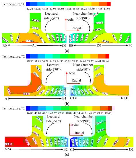 In order to explore the influence of the three schemes on the temperature distribution of the clamping plate in detail, Figure 9 shows the temperature contour distribution of the clamping plate on the leeward side and the near chamber side under different schemes. It can be seen from Figure 9 that the temperature of the clamping plate on the leeward side is higher than that on the near chamber side. As shown in Figure 9a, the maximum temperature of the clamping plate is 47.95 °C under the original structure, and the temperature at A0 and D0 in the middle of the clamping plate is higher. From A0 along the radial direction to B0, A0 along the radial direction to C0, D0 along the radial direction to E0, and D0 along the radial direction to F0, the temperature of the clamping plate gradually decreases, and the temperature of the inner circle side of the clamping plate is less than that of the outer circle. It can be seen from Figure 9b that in Scheme 1, the temperature of the clamping plate decreases gradually from A1 to B1 and from D1 to C1. However, the temperature contour of the inner circle side of the clamping plate is dense, and the temperature contour of the outer circle side of the clamping plate is sparse. Therefore, the cooling effect of the inner circle side of the clamping plate is better. On the one hand, the cooling medium velocity is small on the outer circle side of clamping plate. Moreover, in Scheme 1, the heat source of the clamping plate is larger, which leads to the higher temperature outside the clamping plate and the same temperature in a large area. The maximum temperature of the clamping plate is 89.84 °C. According to Figure 9c, the maximum and minimum temperatures of the clamping plate in Scheme 2 are 49.40 °C and 46.80 °C, respectively, which are 1.45 °C and 4.6 °C higher than the maximum and minimum temperatures of the clamping plate in the original structure. The temperature of the clamping plate under Scheme 2 decreases gradually from A2 to B2.