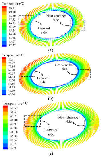 The temperature contour distribution of the clamping plate on the leeward side and the near chamber side: (a) original structure; (b) Scheme 1; (c) Scheme 2.