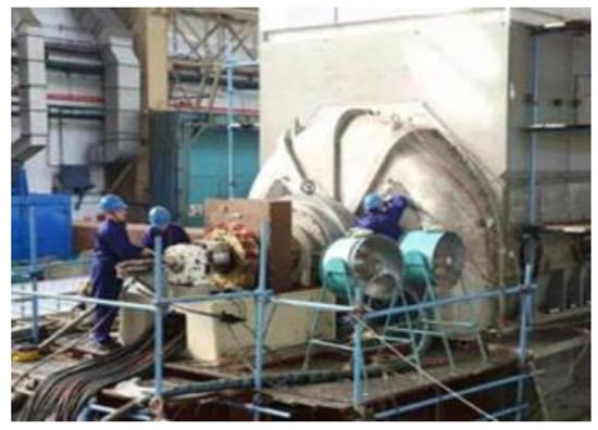 In order to further verify the correctness of the fluid–solid coupling model of the end of the condenser and the accuracy of the calculation results, the temperature test of the 300 Mvar air-cooled synchronous condenser under rated conditions is carried out. The temperature increase test system of the 300 Mvar condenser is shown in Figure 11. The temperature measurement position of the inner edge of the copper shield of the condenser is shown in Figure 12. The temperature measuring element PT100 is bonded to three positions, A, B and C, of the inner edge of the copper shield.
