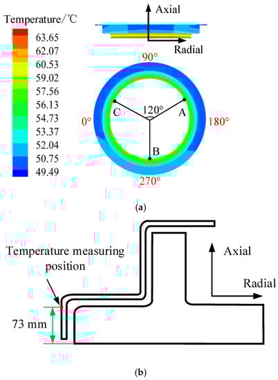 Temperature measurement position of the inner edge of the copper shield: (a) the temperature of the copper shield and the circumferential temperature measurement position; (b) the axial temperature measurement position of the copper shield.