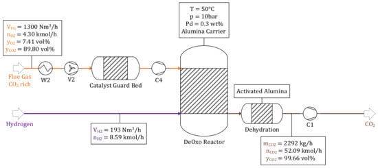 Equation (10) describes the reactor’s underlying chemical reaction. The catalyst bed must be cooled since the reaction is strongly exothermic. H2O is formed as product and needs to be separated by two adsorbent beds loaded with activated alumina. As noted previously, a catalyst guard unit must be installed in front of the DeOxo reactor.