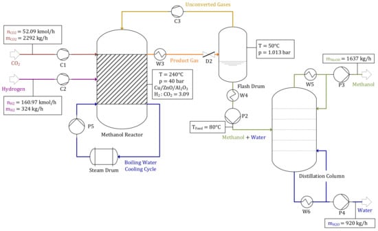 - Van-Dal, É.S.; Bouallou, C. Design and Simulation of a Methanol Production Plant from CO2 Hydrogenation. J. Clean. Prod. 2013, 57, 38–45. [Google Scholar] [CrossRef]