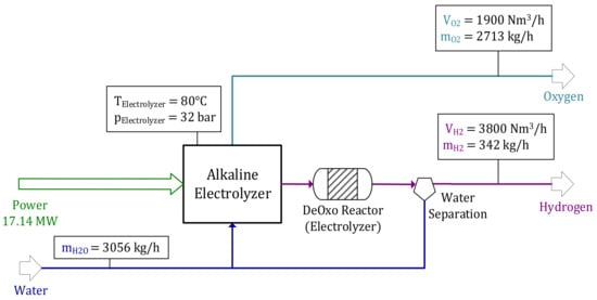 The design and simulation, using Aspen Plus, of a plant producing methanol via CO2 hydrogenation can be found in [18]. CO2 generated by a thermal power plant using coal as fuel was hydrogenated with H2 produced by water electrolysis. The authors declared that O2, generated by the electrolyzer, had to be sold as a by-product and highlighted the possible potential of using it as feedstock for oxyfuel combustion processes without calculating detailed scenarios. A feasibility analysis of a plant producing renewable methanol by chemically storing wind power can be found in [19]. The production costs of H2, being the most significant model parameter, as well as the selling price of methanol were varied. Consequently, selling or using O2 generated by water splitting could be a major factor in improving the facility’s economic feasibility.