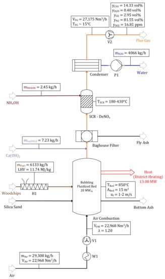 The flue gas’ NOx concentration was based on experimental data listed in [25]. Wooden pellets with a fuel-N content of 0.3 wt% (dry and ash free) were burned in a BFBC under lab conditions. NOx emissions are converted to the fuel-N content of the assumed woodchips stated in Section 2.1. The injected amount of NH4OH was assumed to be 50% larger than stoichiometrically required for the conversion of NOx according to Equation (9).