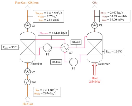 The modeled CO2 capture system was required for process routes using conventional air combustion with flue gas CO2 concentrations below 20 vol%, including an absorber, a regenerator, conveyor units cycling the MEA solution and a heat exchanger improving the process’ heat integration. Main model input parameters were the amount of utilized flue gas as well as the flue gas’ composition. The first output stream, a purified CO2 stream, is transported to a downstream methanol synthesis unit. Off-gas, with a low concentration of CO2 leaving the regenerator, is added to non-utilized flue gas and emitted to the atmosphere. The following parameters have been assumed:
