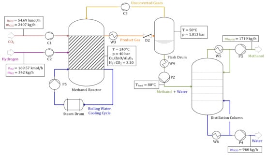 Detailed information regarding the design and modeling of methanol synthesis units valorizing CO2 can be found in [3,8,9,17,40,41].
