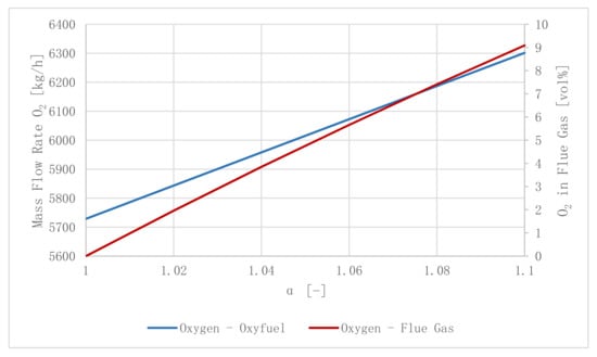 As described previously, oxyfuel combustion is defined as combustion reaction in a mixture of O2 with a technical purity of at least 95 vol% and recirculated flue gas. A standard combustion calculation was conducted.
