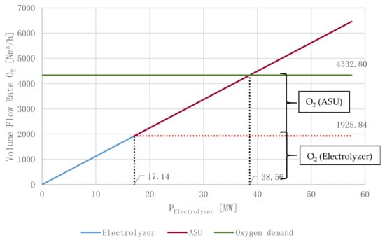 O2 is either provided by an air separation unit (ASU) or the alkaline electrolyzer. Excess of O2 in the oxidant α was defined as the ratio of actual volume flow stream of O2 related to the volume flow stream of O2 required for a stoichiometric combustion, as described in [20].