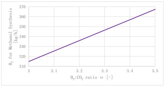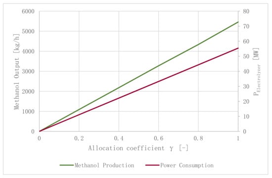 The amount of utilized CO2 is a function of H2 provided by the alkaline electrolyzer, since H2 is required for CO2 hydrogenation inside the methanol reactor. In real applications, the generation of H2 will vary due to fluctuating power levels provided by a wind park. The share of utilized CO2 was defined by the allocation coefficient γ, describing the ratio of flue gas being transferred to downstream process steps and the total amount of flue gas generated. In case no H2 is generated by the electrolyzer, the total amount of generated flue gas is released into the atmosphere (γ = 0).