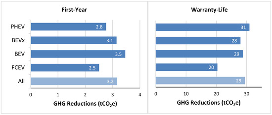 In addition to one-year estimates (), reflecting savings expected during the first year of vehicle operation, rebated reductions are reported in terms of warranty life (). Considering the fairly recent nature of their widespread availability and accelerated adoption, the average length of an EV’s useful life is not yet clear. It can be assumed, however, that EVs are likely to last at least as long as their warranties. Therefore, lifetime emission savings are quantified over the mileage period associated with the vehicle’s battery warranties. The warranty lifetime assumption varies by technology type and is based on the 150,000-mile battery warranty for PHEVs required by California’s Zero-Emission Vehicle Standards [25,26] and the most common battery warranty of 100,000 miles [27] for other EVs. While BEVx batteries are covered for 150,000 miles under California’s Standards, BEVx vehicles are analyzed over the 100,000-mile period of other EVs here as a conservatism and to align more closely with the total miles expected to be driven over the 10-year warranty period associated with the 150,000 warranty miles.