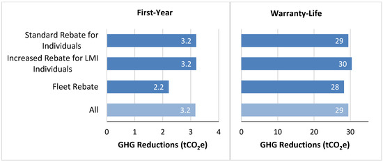 The primary estimates in this study consist of first-year reductions and reductions associated with the warranty life of each vehicle. For individuals, which comprise 97% of the vehicles analyzed, even warranty-life estimates are arguably still a conservative assumption of useful vehicle life for all technology types, depending on a balance of factors. On the one hand, if we assume a consistent annual VMT equal to those used for the first-year estimates of individuals (as detailed in Table 2), the warranty-life estimates represent 11 years of driving for PHEVs and 7–9 years for other vehicle types. Both are roughly equivalent to the 8/10 warranty years associated with the 100,000-/150,000-mile warranties but represent lower mileage than the expected useful life of the vehicles: predictive modeling by the National Renewable Energy Laboratory [41] indicates that batteries may last 12 to 15 years in moderate climates. Further, vehicles may have an even longer life if batteries are replaced, albeit with additional associated private costs if after the warranty period. On the other hand, vehicle use may decline with time and a modest number of rebated vehicles may leave the state upon change of ownership—which averages 6 years [42]. Lifetime GHG savings could be significantly impacted if vehicles leave the state, as the results in this work are based on the carbon intensity of fuel in California. Additionally, grid emissions are likely to decrease significantly over time as aggressive goals move California and other states toward high levels of renewable energy penetration (discussed more in Section 4.2.3).