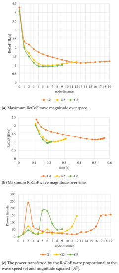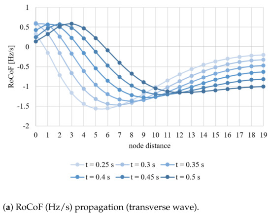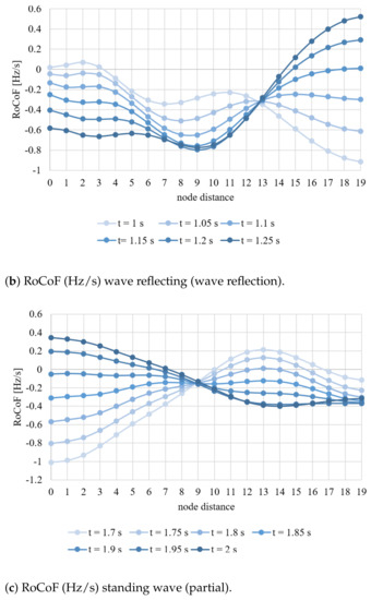 27] using a continuum model. The disturbance propagation has the same characteristics as mechanical waves. The disturbance propagates until it reaches a boundary node, reflects, and creates partial standing waves due to the continuous oscillation feed-in from the perturbed node. Standing waves do not transmit energy. Therefore, the realisation of partial standing waves slows down the decay of the RoCoF magnitude. Another similarity with mechanical waves is that the disturbance wave speed is proportional to the electromechanical medium’s restoring property (transmission capacity—the force internally transmitting the wave [