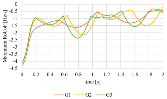 Figure 11a,b. Finally, the maximum RoCoF magnitude recorded at each bus is in