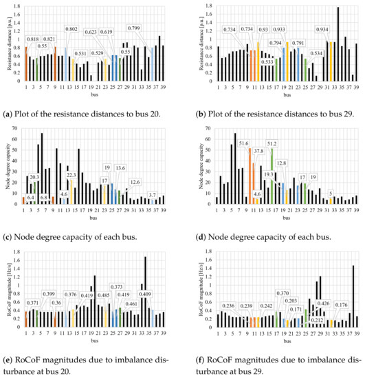 Figure 11a,b show the resistance distances (in per-unit [p.u.]) for each bus to the disturbed bus. Some buses with similar resistance distances are colour coded, e.g., for the disturbance at bus 14 scenario, the bus pair (2, 12)-red, (5, 11)-blue have similar resistance distances but are at different locations. The node degree capacity of each bus is plotted in