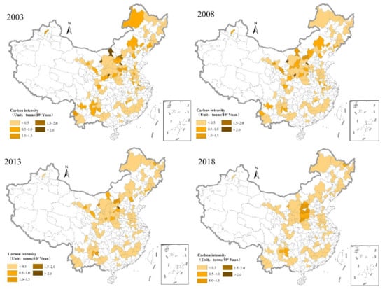 During 2003–2018, the average carbon intensity of China’s RBCs decreased from 0.595 T/103 yuan in 2003 to 0.499 T/103 yuan in 2008. This continued to decline to 0.374 T/103 yuan in 2013, dropping to 0.283 T/103 yuan in 2018, a decline of 52.4%. The carbon intensity of RBCs showed a general downward trend. From the perspective of spatial distribution, there were 12 RBCs with a carbon intensity greater than 1.0 T/103 yuan in 2003, among which Wuhai (6.929 T/103 yuan), Shizuishan (4.147 T/103 yuan), Tongchuan (3.146 T/103 yuan), Baotou (3.098 T/103 yuan), and Yangquan (2.679 T/103 yuan) had intensities of greater than 2.0 T/103 yuan. In 2008, there were eight RBCs with a carbon intensity of more than 1.0 T/103 yuan, among which four were RBCs with a carbon intensity of more than 2.0 T/103 yuan: Wuhai (5.371 T/103 yuan), Shizuishan (3.330 T/103 yuan), Tongchuan (3.254 T/103 yuan), and Yangquan (2.036 T/103 yuan). In 2013, there were seven RBCs with a carbon intensity greater than 1.0 T/103 yuan, among which Wuhai (2.894 T/103 yuan) and Yangquan (2.065 T/103 yuan) were the only RBCs with carbon intensities greater than 2.0 T/103 yuan. By 2018, all the RBCs with carbon intensities greater than 1.0 T/103 yuan were in Shanxi Province, including Xinzhou (1.497 T/103 yuan), Lvliang (1.427 T/103 yuan), Yuncheng (1.168 T/103 yuan), and Jinzhong (1.056 T/103 yuan). These spatial and temporal patterns of carbon intensity are illustrated in Figure 3.