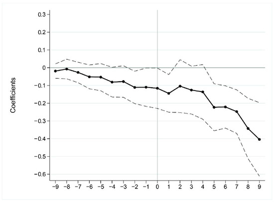 It can be seen that, before the opening of an HSR line , the value of fluctuated around 0, with the 95% confidence interval containing the 0 value. This indicates that the changes in the coefficient during this period are not large. It can be considered that before the opening of the HSR line, the fluctuations in carbon intensity are not obvious, and there is a parallel trend. After the opening of an HSR line , especially after , the values of show a significant downward trend, and the 95% confidence interval no longer contains 0. Therefore, the sample data in this paper are consistent with the parallel trend hypothesis before the opening of an HSR line, and the DID estimation can be used.