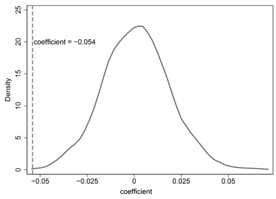 For a further robustness check, placebo tests were performed in order to ensure that the carbon intensity of RBCs would not be affected by random factors such as the variable is one or zero. When control variables are fixed, we take the variable in any one RBC as one randomized trial to estimate the coefficient of explanatory variable, and the variable satisfies a 0–1 distribution. If the regression coefficients of the variable of multiple randomized trials are concentrated around zero values, it indicates that the carbon intensity of RBCs would not be affected by random factors such as the variable , and the existing result is reliable, if not, the existing result is not reliable. Figure 5 shows the regression coefficients of the variable of one thousand randomized trials concentrate around zero value, thus the coefficient of explanatory variable is reliable.
