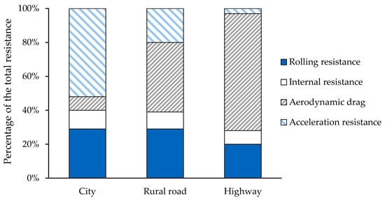 Figure 1 outlines the percentage contributions of internal and external resistances (the slope resistance is excluded) in three different scenarios: city, rural road, and highway. Mass-dependent resistances account for approximately 92% of the losses in the city scenario, 55% in the rural road scenario, and 30% in the highway scenario [