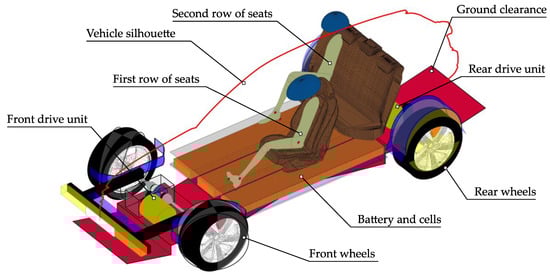 17] but employing an up-to-date vehicle dataset. Moreover, the model is encapsulated by a vehicle architecture tool that includes an energy consumption simulation and a package model. The former calculates the energy consumption and estimates the battery energy requirements depending on the vehicle mass and target range. The latter sizes and positions the components and checks the feasibility of the vehicle. This ensures that the simulated vehicle is feasible in terms of energy consumption, mass, and package. All the parts of the vehicle architecture tool (energy consumption, parametric mass model, and package model) are implemented in MATLAB.