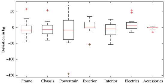 Figure 5 depicts the deviation (in kg) between calculated and real modules masses. The powertrain module has the highest MAE, and the mean deviation between calculated and real powertrain masses is equal to 37 kg. This is because in most vehicles it is the heaviest module. For example, in BEVs such as the Audi e-tron [