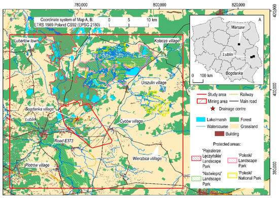 The study was conducted in the mining area and near the “Bogdanka” mine. The area is approximately 1800 km2 and is located in the south-eastern part of Poland, 30 km northeast of Lublin (Figure 1A). The area of interest encompasses a part of the “Western Polessye” macro-region, a subregion of the “East European Plain” mega-region. It is situated at an elevation between 170 to 191 masl (meters above sea level) [139].