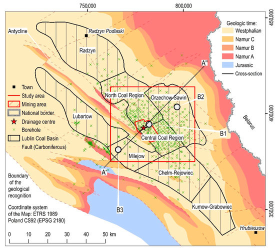 The location of the Lublin Coal Basin and the Central Coal Region of Poland in the area of interest; the geological and tectonic conditions of the study area without Quaternary and Cretaceous deposits on a cutting plane of 750 mbsl (meters below surface level) and the spatial distribution of boreholes. Table 1 displays data on the stratigraphy and depth of geological strata and aquifers in selected boreholes B1, B2 and B3. Source of data: the Polish Geological Institute-National Research Institute.