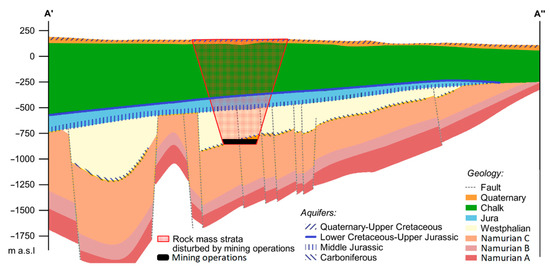The Mesozoic, Tertiary and Quaternary strata are distinguished in the overburden of the hard coal deposit. Mesozoic sedimentation followed a stratigraphic gap that spanned the Triassic and Lower Jurassic periods. Middle Jurassic sediments are composed of limestones and dolomites with thicknesses ranging from 80 to 120 m. The Cretaceous deposits are 400 m to 600 m thick and constitute the majority of the Carboniferous overburden. They are formed by chalk, marls, marly limestones and carbonate-silicate limestones. The Cretaceous surface was heavily eroded during the Alpine orogeny. Therefore, there are no Paleocene sediments in the study area. Instead, quartz and clay sands represent the Neogene formations. These deposits vary in thickness, ranging from a few to several m. In the study area, the thickness of the Pleistocene is also variable. It ranges from zero m in Cretaceous outcrops to several dozen m in more extensive tectonic valleys. Sand, gravel and clay constitute Pleistocene sediments. River and lake sediments from the Holocene periods include peat and organic sludge [141,145].