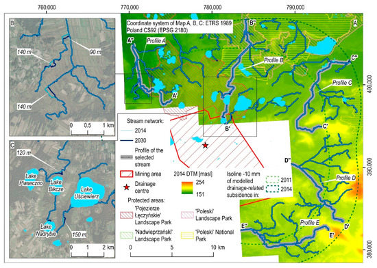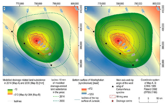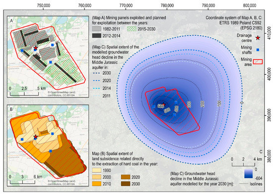 (A) The spatial distribution of selected mining fields and mining shafts of the “Bogdanka” mine; (B) the spatial extent of land subsidence resulting from the migration of the post-mining void (land subsidence resulting directly from mining exploitation of the hard coal) in 1990, 2000, 2010, 2020 and 2030 estimated based on the Knothe influence function, modified after Guzy and Malinowska [67]; (C) the spatial extent of the depression cone and groundwater head decrease in the Middle Jurassic aquifer in 2011, 2014, 2020 and 2030 estimated based on the hydrogeological modelling, modified after Guzy and Malinowska [67]. Source of data: the Mine and Surveying Department of the “Bogdanka” mine.