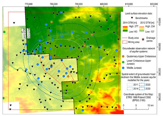 The research presented here was conducted between 1959 and 2030. This time span includes the period before mining exploitation, and rock layer drainage began (1959–1981), the time of the most severe drainage of the rock mass due to mining exploitation (1981–2014), and the most recent and planned hard coal exploitation (2014–2030). The research area was determined based on the groundwater head change modelling results in the Main Jurassic aquifer due to mining drainage for 2030. As a result, the maximum predicted spatial extent of the depression cone in the principal aquifer and thus the maximum forecasted spatial extent of land subsidence due to mining drainage could be included in the presented study. This area is a rectangle 40 by 45 km in size, with a total area of 1800 km2.
