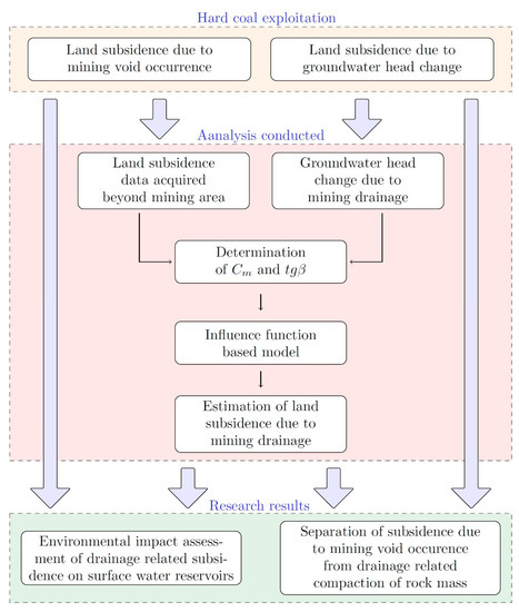 The first part of the research determined land subsidence due to mining-induced drainage in the area of interest (Section 3.1). In the second part of the study, previous research on the impact of mine drainage on groundwater head change in the Middle Jurassic aquifer was used [67]. The findings of these studies, along with data on mining-induced land subsidence, were used to develop an influence method-based model of ground movements related to mining drainage (Section 3.2). Finally, in the third section of the study, the impact of mining drainage on surface water reservoirs was evaluated using calculated values of aquifer-drainage related land subsidence (Section 3.3).