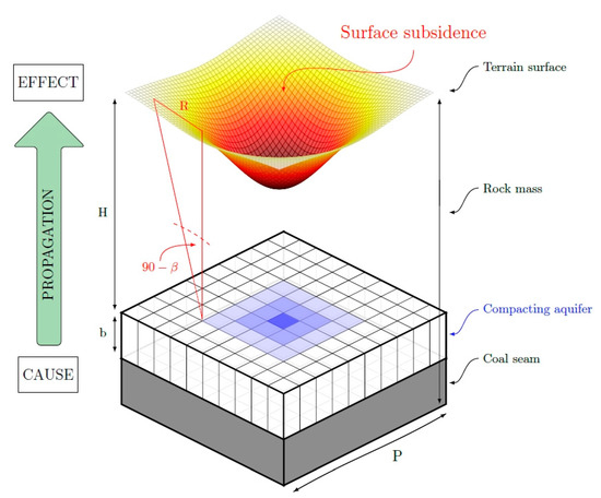 In the present study, the groundwater-related land subsidence influence function model was developed using the stochastic Knothe-Budryk theory. In this geometrical-integral approach, the change in the volume of the post-mining void is assumed to be the process causing land subsidence [156,157]. Since the original version of the Knothe-Budryk theory was intended to forecast rock mass deformation caused by mining deformations, the filling of the post-mining void is demonstrated by a random movement of rock particles towards the interior of the void [112].