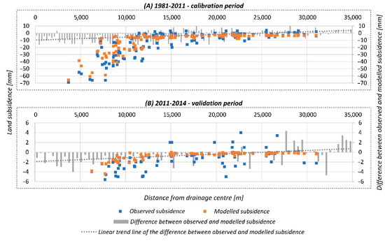 The literature presents a variety of methods for modelling ground surface displacements caused by rock mass drainage. However, very little research has been carried out on the land subsidence resulting from underground mining-related groundwater pumping. Hejmanowski et al. [138] attempted to investigate the direct and indirect effects of mining on the occurrence of land subsidence. In the conducted research, various combinations of the Knothe model parameters were analyzed, which would improve the accuracy of prediction of rock mass deformation. According to the authors, the proposed methodology for conducting this type of analysis must be closely tailored to the local mining and geological conditions, which necessitates a thorough understanding of the study area through in-situ measurements. Witkowski and Hejmanowski [71] used a multilayer perceptron network and the supporting vectors method to analyze and simulate a large-scale subsidence trough near one of the underground mines in Poland. The neural network was given the task of processing measurement data to determine the mapping process. The authors obtained satisfactory simulation results, indicating and recommending empirical data to validate the modelling outcomes. Malinowska et al. [70] investigated the spatiotemporal distribution of ground movements caused by groundwater head changes induced by copper ore and anhydrite mining in Poland. Traditional surveying methods and persistent scatterer Satellite Radar Interferometry were used to determine ground movements in the study. Based on these findings, a comparative analysis of the dynamics of ground movements, the rock mass’s mine life and hydrogeological conditions was carried out. These analyses enabled the time factor for land uplift modelling to be determined.