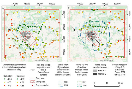Land subsidence resulting from mining operations is revealed in the form of direct and indirect impacts, as mentioned in Section 2.1.3. Direct impacts include extracting hard coal, forming a post-mining void, and its migration to the ground surface. On the other hand, indirect influences result from the drainage of the rock mass that occurs during hard coal extraction. Nonetheless, direct and indirect impacts overlap and form a single land subsidence trough above the mining area and within the immediate range of the impact of hard coal extraction.