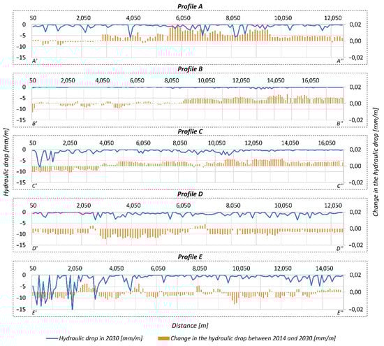 Nevertheless, underground mining is also associated with the drainage of rock layers for both technological and safety reasons [46]. Mine drainage typically starts during the mine construction stage. It is carried out continuously throughout the mine’s life cycle and usually lasts until the mine is closed. Nonetheless, in many cases, even after the closure of mining operations, mine drainage maintenance is still required for safety reasons [66]. Due to the long-life cycle of underground mines, which can range from a few to several dozen years, the volume of groundwater pumped out of the rock mass is significant and, in many cases, exceeds billions of m3 [67]. Such a substantial volume of groundwater withdrawn and a long-term process of mining-induced drainage results in a permanent change in the aquifer system’s hydraulic conductivity and storage properties. Therefore, a decrease in hydrostatic pressure is observed at the large-scale depression cone [67,68]. The decrease in the groundwater head causes consolidation and compaction of the drained aquifer and the propagation of rock mass deformation to the terrain surface [25,69]. As a result, land subsidence caused by groundwater withdrawal occurs, and, therefore, watercourses and surface reservoirs may be impacted [7,15,25].