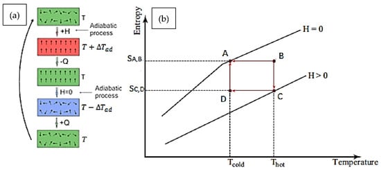 The magnetic Brayton cycle is composed of two adiabatic processes and two isofield processes, as shown in Figure 2a [48,49]. In this cycle, two heat temperature sources—high temperature (TH) and cold temperature (TC)—as well as two constant magnetic fields (H0 and H1) were used. The fundamental stages of the Brayton cycle are as follows: The first is the adiabatic magnetization process (A–B). During the isentropic process, magnetic material is transferred from magnetic field H0 to H1, increasing the temperature of the magnetocaloric material. The second phase is isofield cooling (B–C) in which heat is rejected from the material by a continuous magnetic field of H0, accompanied by adiabatic demagnetization (C–D), in which the magnetic material cools down and no heat flows in or out of the magnetic refrigerant. The final step is the isofield heating process at H0 (D–A). The heat is absorbed by the magnetic refrigerant, which causes an external device to cool. The absorbed heat (, rejected heat (), work (w), and COP can be determined as: