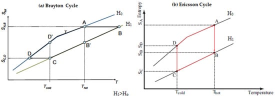 The Ericsson cycle comprises two isothermal and two isofield processes, as depicted in Figure 2b. The Ericsson cycle resembles the Brayton cycle in appearance. The main distinction is that magnetization and demagnetization occur isothermally rather than adiabatically. The Ericsson cycle requires a heat regeneration process. The basic operations of this cycle are: The isothermal magnetization process (A–B), in which the magnetic field increases from H0 to H1 at a constant hot working temperature TH, which increases the upper fluid temperature due to heat transfer from the magnetic refrigerant to the regenerator. Isofield heat rejection (B–C) is the second step. The magnetic field H1 remains constant and heat from the magnetic refrigerant is passed to the regenerator fluid. In isothermal demagnetization (C–D), at a constant operating temperature TC, the magnetic field drops from H1 to H0, in which the temperature of the fluid is reduced due to the magnetic refrigerant absorbing heat from the lower generator’s fluid. The final stage is isofield heat absorption (D–A). A constant magnetic field of H0 exists and the heat is absorbed by the regenerator fluid. The absorbed heat (, rejected heat (), work (w), and COP can be evaluated as: