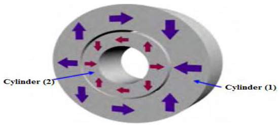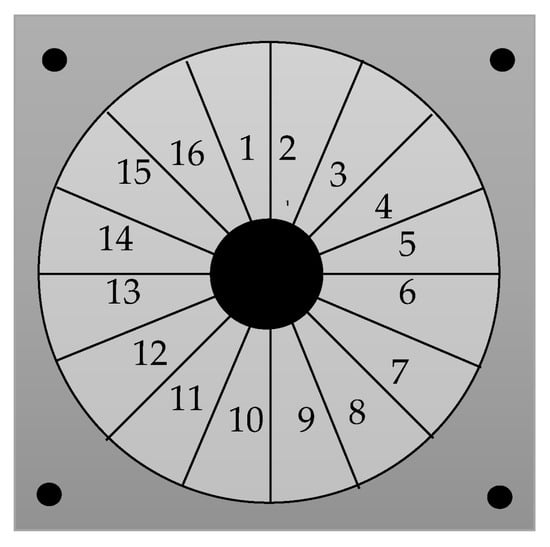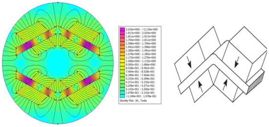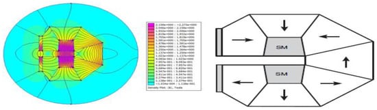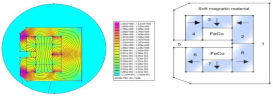 A C-shaped magnetic system with a strong homogenous magnetic flux intensity in the core was studied by Lee et al. [100], as demonstrated in Figure 17. One of the horizontal segments of an eight-segmented Halbach cylinder has been omitted in this configuration. Based on the FEMM simulation, a magnetic flux density of 2.1 T was generated in the high flux field. Vasile and Muller [101] suggested another C-shaped arrangement of rectangular magnetic parts, as displayed in Figure 18. This configuration comprised revolving magnets arranged in a circle with magnetocaloric material inserts. The cross-sectional area of these magnets was 9.2 L/m, with a high field difference of 0.75 L/m. This arrangement produced an average flux density of 0.8 T and was expected to have a Pfield of 0.90. Alahmer [102] suggested a magnetic refrigeration system in the form of a spinning C-shape near room temperature. This design is made up of 20 sets of permanent magnets, each measuring 37 mm × 22 mm × 10 mm. To direct the flux lines and create the “C” form seen in Figure 19, 16 parts with a soft material frame were used. The remaining four parts were used in the heat transfer fluid’s fixed shell under the spinning wheel of magnetocaloric material (two pieces are in the fixed case and the remaining two pieces are placed outside the case). It was possible to achieve a mean flux density of around 0.6 T in the high flux region and a value of 0.02 T in the low flux region.