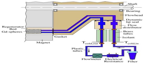 Tušek et al. [103] experimentally investigated the magnetic refrigeration device shown in Figure 20, which basically consists of three components: the AMRR is located in the center of the hub, and the magnet assembly is made up of four Nd2Fe14B-type permanent magnets with a combined energy product of 50 MGOe, as well as a soft ferromagnetic material. The magnetic flux density in the magnetization region is 1.15 T, while the magnetic flux density in the demagnetization area is 0.007 T, and the factor Λcool is 0.064. The highest temperature span (19.8 K) was achieved with a 0.3 Hz operating frequency and a cooling power of 0 W. Trevizoli et al. [104,105] assessed the output of an AMRR, which used a nested Halbach cylinder magnetic circuit to generate a maximum magnetic flux density of 1.69 T, as presented in Figure 21. Different operating frequencies of 0.25, 0.5, and 1 Hz were used to set the operating AMRR frequency. The utilization factor was varied between 0.14 and 1.15. At a zero-temperature span, the overall cooling power was 53.7 W, with a utilization factor of around 0.77 and a frequency of 1 Hz. The highest temperature span achieved was 30 K. With an operating frequency of 0.25 Hz and a utilization factor of 0.77, the maximum COP of 4.6 was obtained. Trevizoli et al. [106] studied different regenerative geometries; namely parallel plates, pin sets, and packed spheres on the performance of active magnetic regenerators. They discovered that the maximum temperature spans of the parallel plates were often smaller and performed worse than the other geometries, particularly at high frequency and utilization factors. Thermal behavior was much better with the pin sets and lined beds of spheres than parallel plates. Legait et al. [107] stated that it is critical to know the heat transfer changes that occur in the regenerator, as well as the impact of the magnetocaloric material’s intrinsic properties, in order to maximize the performance of the AMRR. Lei et al. [108] simulated a one-dimensional numerical model to select and optimize the AMRR’s geometry. Five regenerator geometries, namely a parallel plate framework, a bundled screen bed, a bundled sphere bed, a rectangular micro-channel layer, and a circular micro-channel sequence, were suggested. The use of parallel plates and micro-channel matrices yielded the highest theoretical efficiency. On the other hand, the packed screens and the packed sphere beds were better for realistic applications. To examine the AMRR, Allab et al. [109] established a 1D time-dependent model. The authors did not consider the diffusion phenomenon along the bed. Only the convective exchanges at the fluid–regenerator interface were taken. The finite-difference method was used to numerically simulate the model in order to compare its results with the experimental data. The analytical model was quite reliable regarding the thermal phenomenon. Except for small fluid flow rates, where axial heat conduction in the Gd was no longer negligible, the model demonstrated good agreement with experimental observations. Roudaut et al. [110] modified the model and utilized it to undertake a parametric study of a parallel plate AMRR. Aprea et al. [111] developed a two-dimensional (2D) multiphysics model to numerically describe a packed bed of rectangular regenerator filled with magnetocaloric material spheres operating at room temperature as an AMRR cycle. Experiments of zero load at different cycle frequencies and heat removal temperatures were carried out. The simulation findings showed an excellent match to the experimental data. Scarpa et al. [112] proposed a classification for magnetic refrigerators at room temperature according to the magnetic sources, magnetocaloric materials, and the motion of the active elements of the device. This classification was according to 12 different criteria, marked on a scale from 1 to 12.