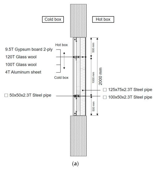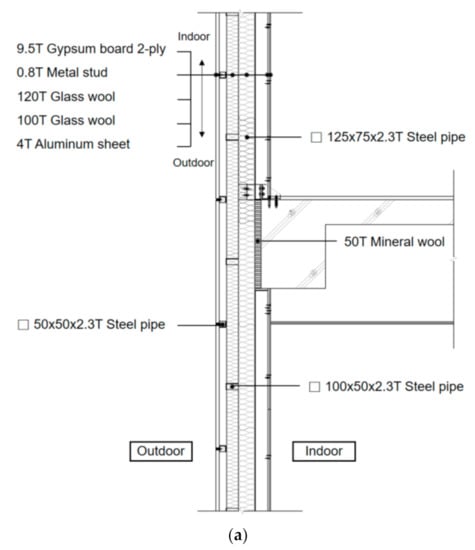 For the base case, rectangular steel pipe frames with cross-sectional dimensions of 125 mm × 75 mm and 100 mm × 50 mm are installed vertically and horizontally, respectively, and two layers of glass wool with a total thickness of 220 mm are inserted between frames. On the outdoor side of the frame, a rectangular steel pipe track with cross-sectional dimensions of 50 mm × 50 mm is installed to fix the exterior finish material, and the aluminum sheet with a thickness of 4 mm is installed for an exterior finish material. There are air cavities between the gypsum board (an interior finish material) and the glass wool, and between the aluminum sheet (an exterior finish material) and the glass wool.