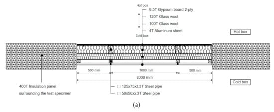 For the U-factor test of the base case and alternative case, mock-ups were manufactured for the same analysis area as the simulation. The U-factor test method for curtain wall systems is dealt with in KS F 2278 [16]. The size of the test specimens specified in KS F 2278 is 2 m × 2 m. Accordingly, mock-ups were manufactured by including two vertical and horizontal frames, as well as the vertical and horizontal midpoints of the aluminum sheet, an exterior finishing material, as shown in Figure 10, Figure 11 and Figure 12. The maximum thickness of the insulation panel surrounding the test specimen (see Figure 11) installed in a government-certified testing laboratory (Korea Laboratory Accreditation Scheme) in South Korea is 400 mm, and the maximum allowed thickness of the test specimens is 350 mm. Since the thickness of the curtain wall in simulation models was 419 mm, mock-ups were manufactured by excluding the air cavity (100 mm thick) between the gypsum board and glass wool as well as the metal stud installed inside the air cavity for fixing the gypsum board. Owing to the constraints of the test method specified by KS F 2278, the floor structures and primary connectors included in the simulation models were excluded for the mock-ups. Mock-ups were prepared by including thin membranes that were excluded from the simulation models, such as vapor retarders. Except for these, the configuration of the mock-ups was the same as that of the simulation models. Figure 11 and Figure 12 show the horizontal and vertical sections of the mock-ups for the base case and alternative case.