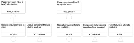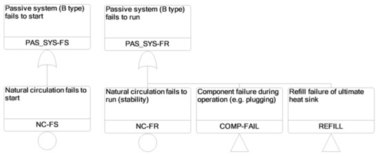 When passive systems are concerned, other failure modes are to be considered, such as mechanical equipment failures (e.g., heat exchanger plugging, rupture or leak, etc.), which can also lead to failure during operation [] and alter the physical stability, and human errors, which can influence the long-term operation of a passive system. In some cases (for example, []), these failure modes are considered in a separate FT.