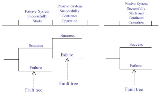 In the former case, the FTs presented in Figure 1 and Figure 2 are placed behind the two distinct headers (‘Passive System Successfully Starts’ and ‘Passive System Successfully Continues Operation’), whereas in the latter case, the two FTs are linked together into an ‘OR’ gate and placed behind the single header ‘Passive System Successfully Starts and Continues Operation’.