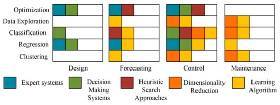The process is extensively used in industries as well as by consumers in their day-to-day activities. Further, the application of AI for the digital transformation of power systems is identified to have massive potential to aid in improving stability, reliability, dynamic response, and other essential advancements for the power system network [2]. Currently, AI is targeted at implementing the design [3], forecasting [4], control [5], optimization [6], maintenance [7], and security aspects of the power system [8] as illustrated in Figure 1. Out of these identified areas of AI application, the characteristics of design, forecasting, control, and maintenance are widely discussed in the literature. The elements of cybersecurity are developing and were considered the future trends for AI applications in PV power systems. The data availability in PV power systems’ operation has advanced the development of AI to assist the system learning process in the design, control, and maintenance aspects for improving efficiency and reducing response time. This approach encouraged research activities in a data-driven perspective to analyze the complex and challenging problems in power systems. A layout identifying the techniques between the function and application of AI in power systems is mapped as shown in Figure 2.